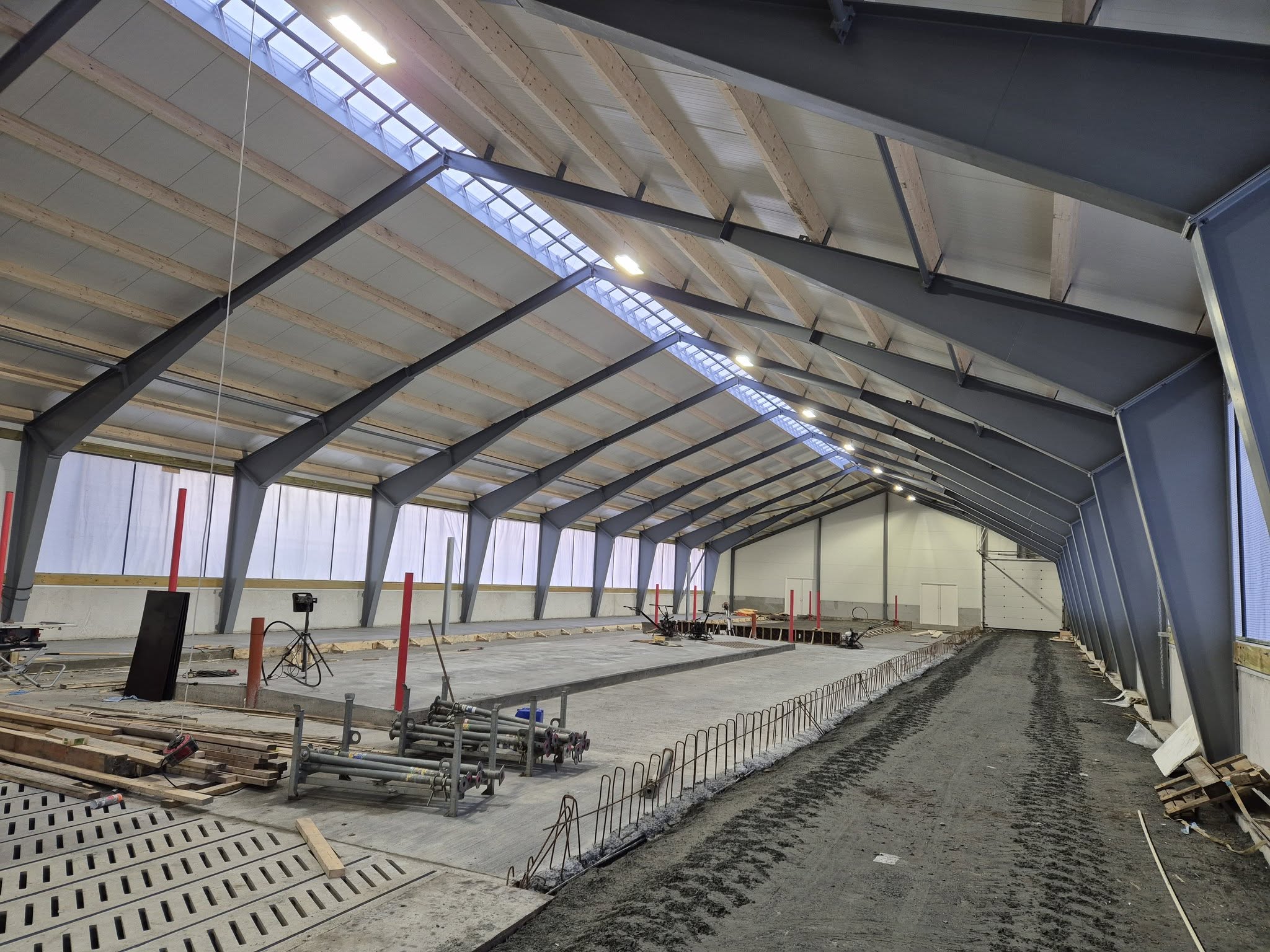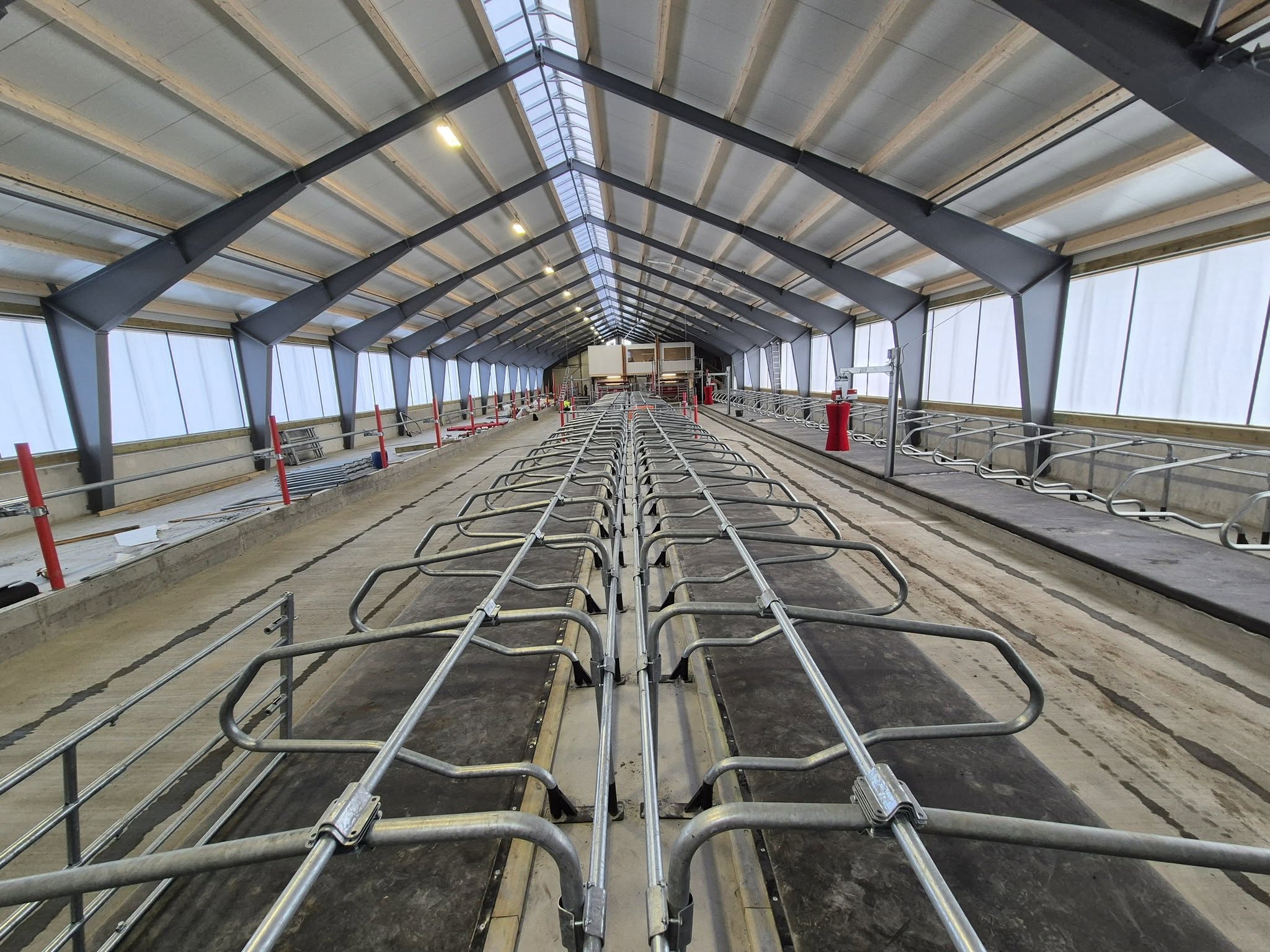 Fjøset skiller seg ut med sin romslighet. Ekstra takhøyde og de nesten tre meter høye gardinene sikrer god naturlig ventilasjon og rikelig med lys. Den unike løsningen med to kulverter for gjødselhåndtering, som kan kobles sammen, er forberedt for fremtidig levering til biogass.