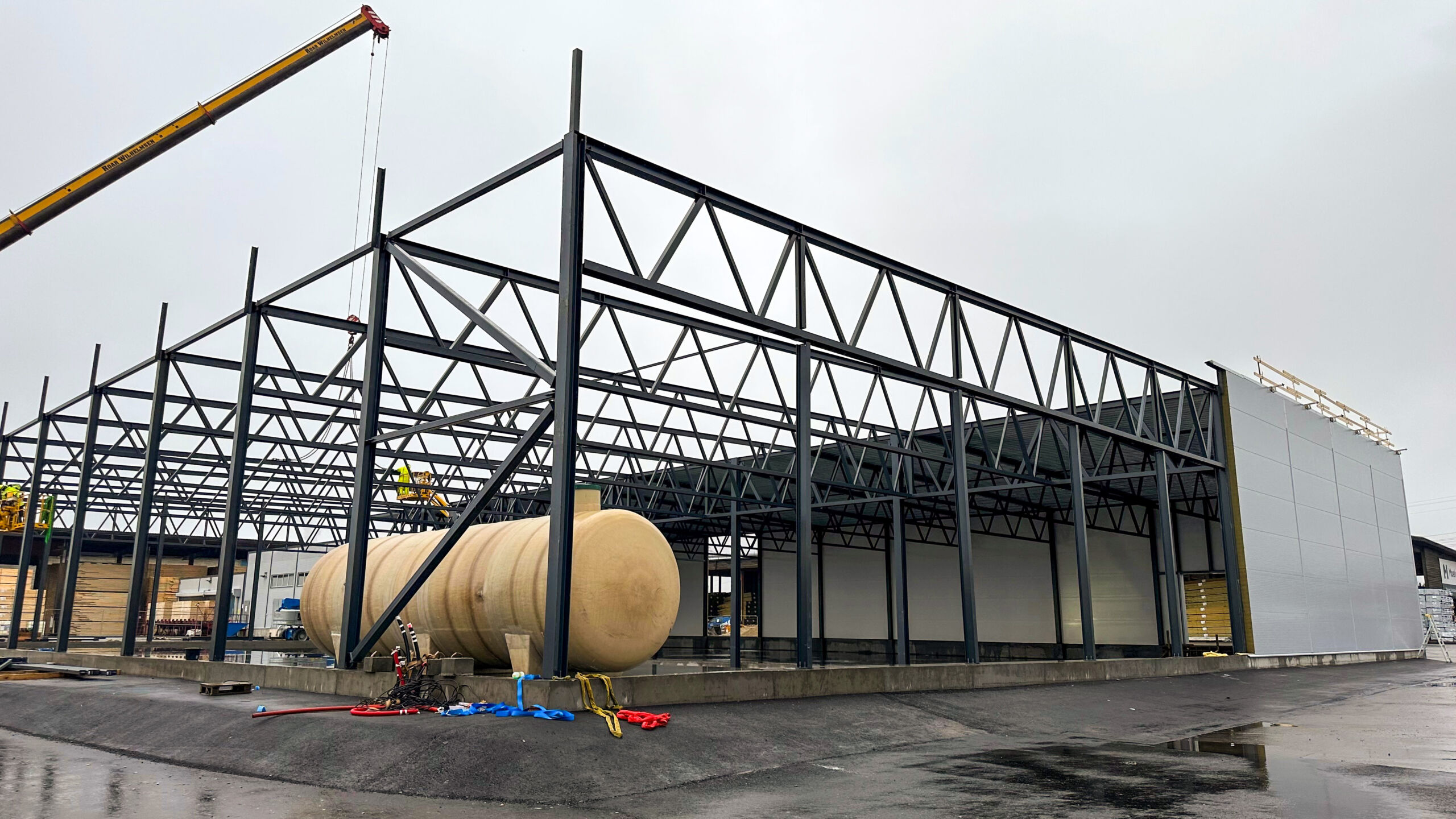 For Moelven har vi satt opp et impregneringsanlegg på ca 2.530 m². Stålkonstruksjon med gitterdragere, sandwich-panel SPA E for yttervegger som gir en utmerket brannmotstand og TRP plater med taktekking.