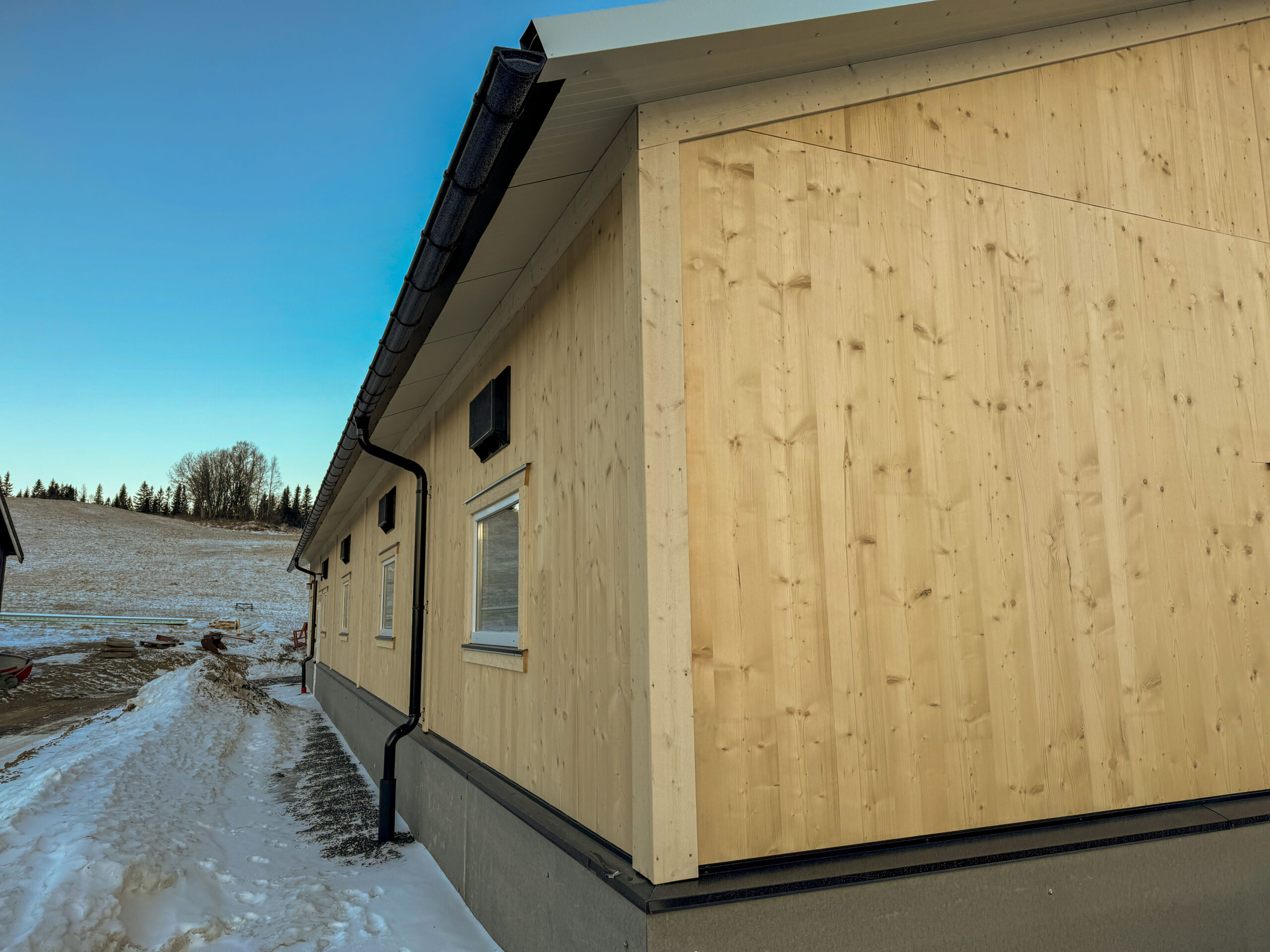 Ogndal: Treveggene er 80 mm tykke, noe som gir god akustikk og godt inneklima. Sandwich-elementene i taket er 100 mm tykke. Grunnmuren har en brystning på 65 centimeter som fanger opp kuldebroen, og det er isolert 5 cm på utsiden.