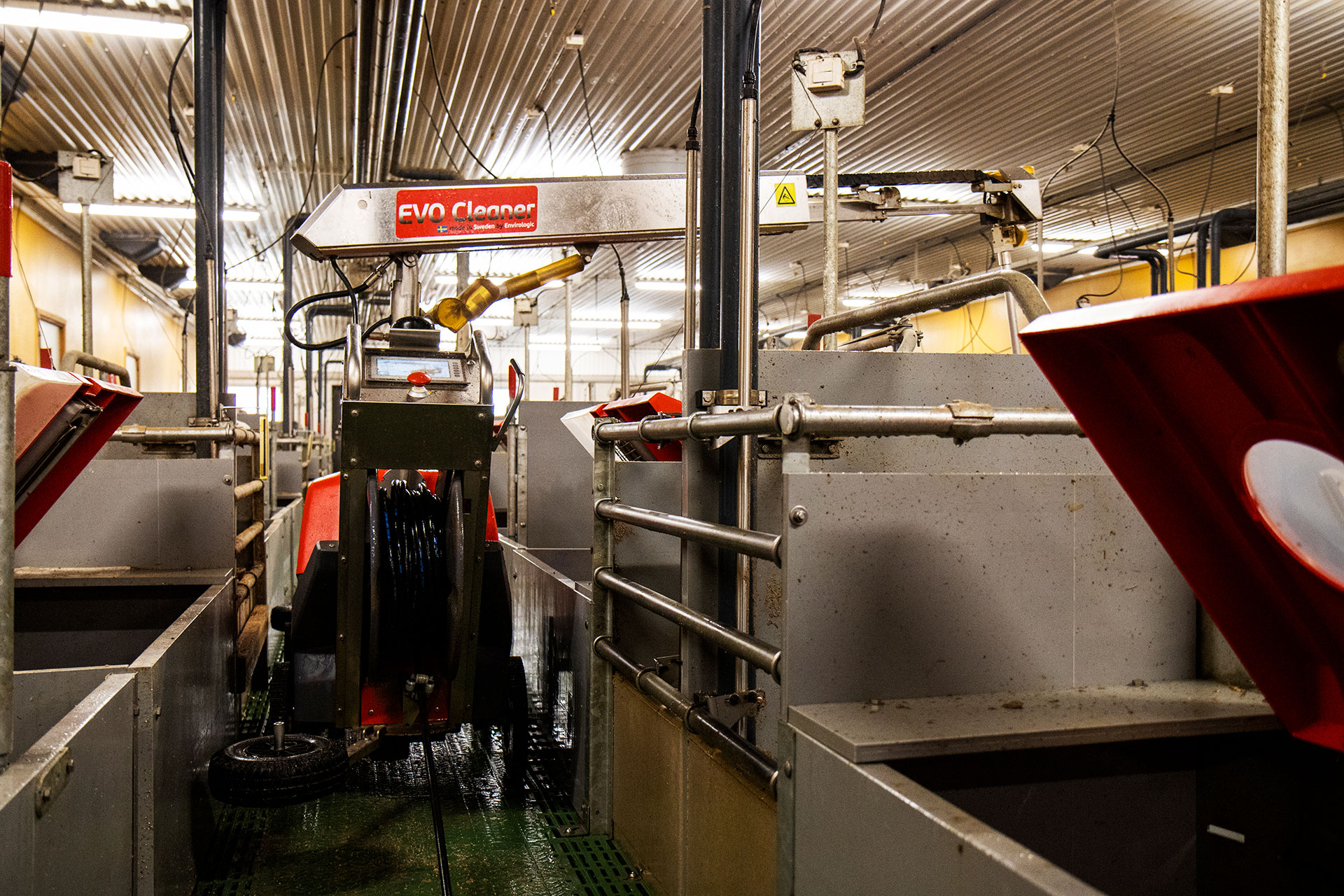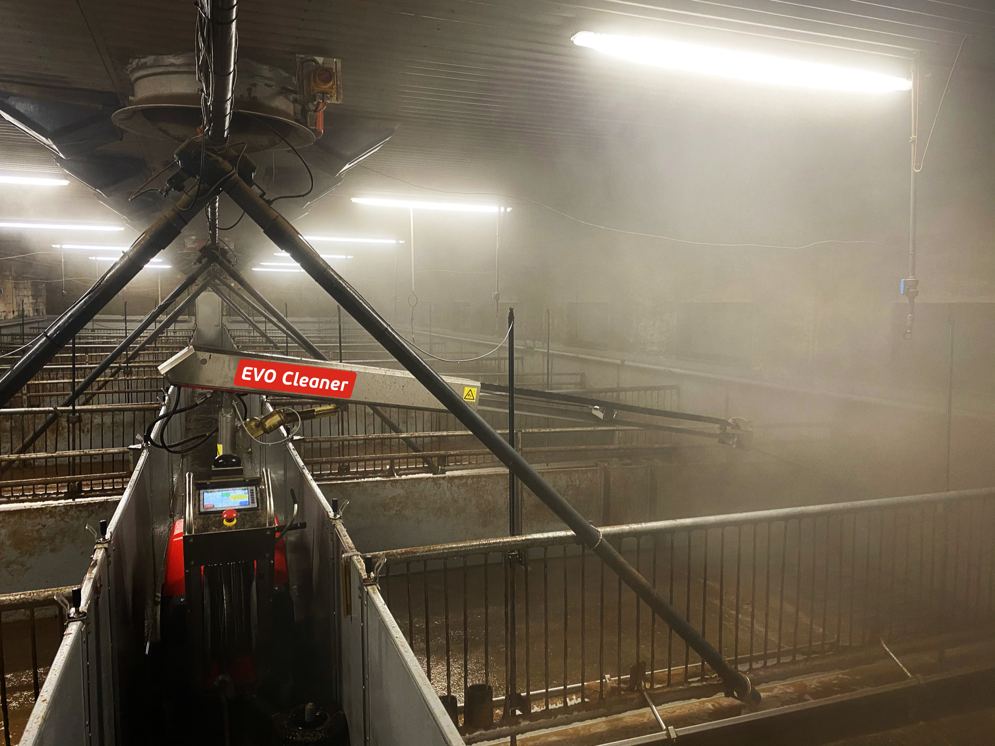 EVO Cleaner er en unik og patentert vaskerobot utviklet for grisefjøs. Roboten effektiviserer og muliggjør automatisk vask hele døgnet.