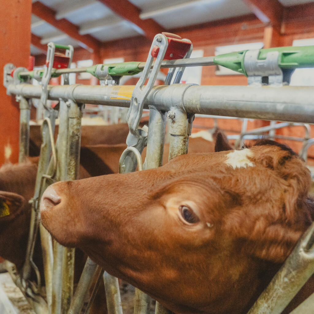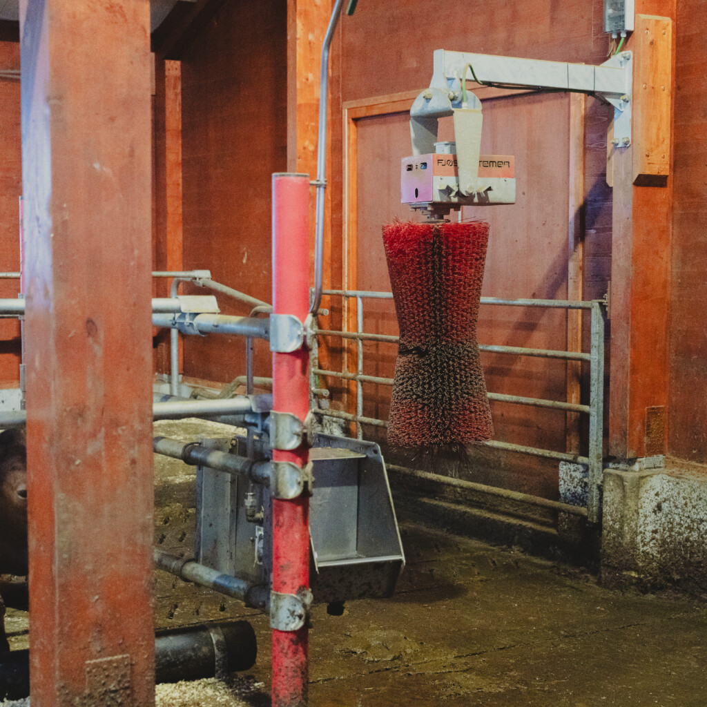 Sjølve hjarta i fjøset er ei to-rekkers liggebåslysing for mjølkekua. Her er det lagt vekt på god plass, mjukt underlag frå Promat og Jourdain-innreiing for å sikre optimal liggekomfort. Logistikken er planlagd for å gje dyra ro, medan bonden får ein effektiv arbeidsdag.