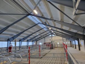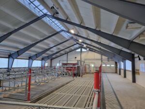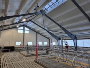 Fjøssystemer Bygg har levert fjøset med stålkonstruksjon, limtreåser, sandwich tak og vegger, inkl servicerom. Hjelset Bygg AS, har stått for betongarbeidene.