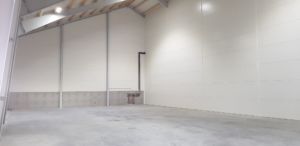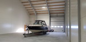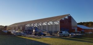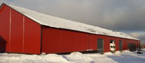 Bygget med stålbuer, treåser og sandwich på tak og vegg.