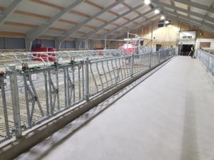 Tilbygg på 860 m² levert av Fjøssystemer Bygg. Bygget er satt opp med stålbuer, massivtre i vegg og sandwich i tak. Naturlig ventilasjon. Bygget rommer 55 melkekyr