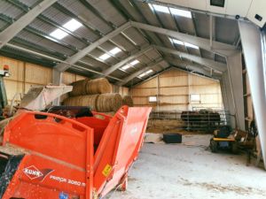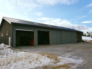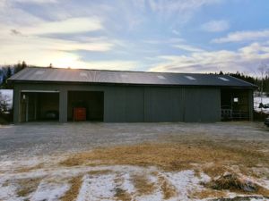 Bygget er 12x30m. Bærekonstruksjon av stål med vegger kledd med ferdig grunnet låvepanel.