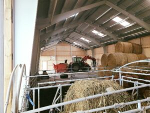 På taket er det brukt takplater og lysplater. Han har valgt å ha 2 skyveporter og 2 leddheiseporter