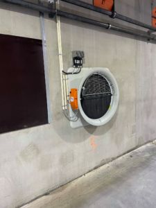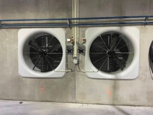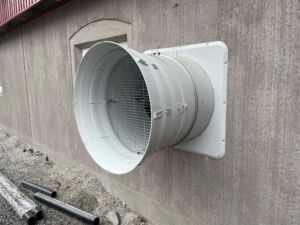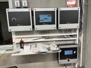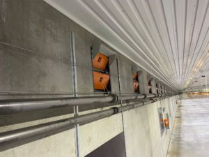 Veggmonterte LPC vifter, veggventiler, gavlvifter, alarm, nødopplukk og Viper Touch klima- og produksjonskomputer med BigFarmNet app.