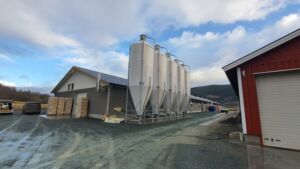 Vi har levert 5 FS glassfibersiloer med kapasitet på 31m³ – to av dem lagrer trepellets for biovarmeanlegg mens de tre siste er for kraftfôr.