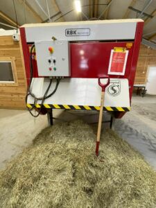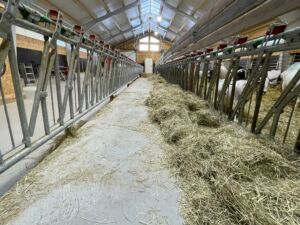 Fjøset er med talle, Jourdain innredning, Wopas stolper, naturlig ventilasjon og Serigstad rundballekutter.