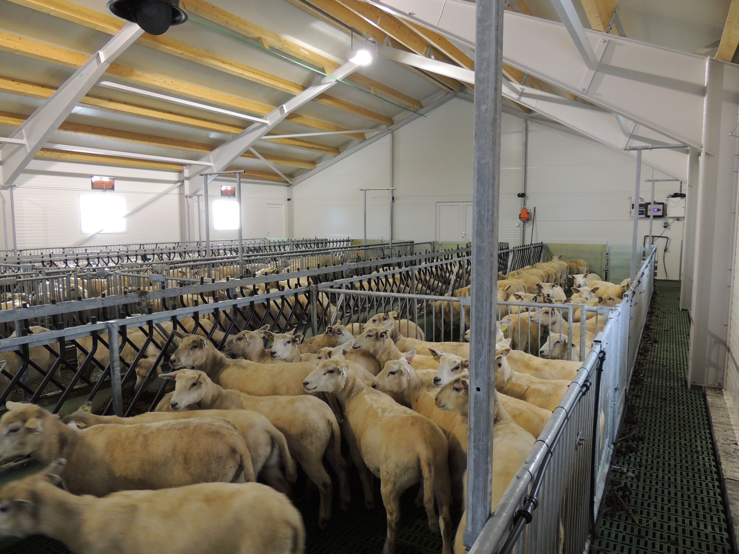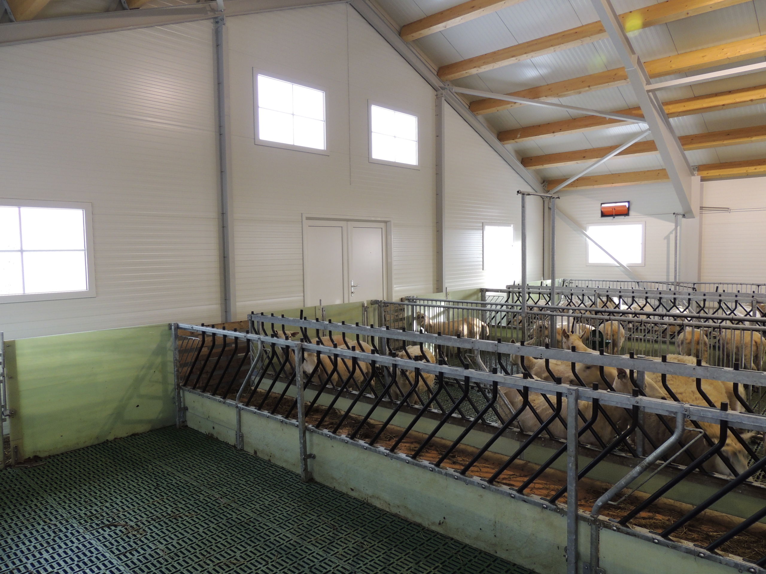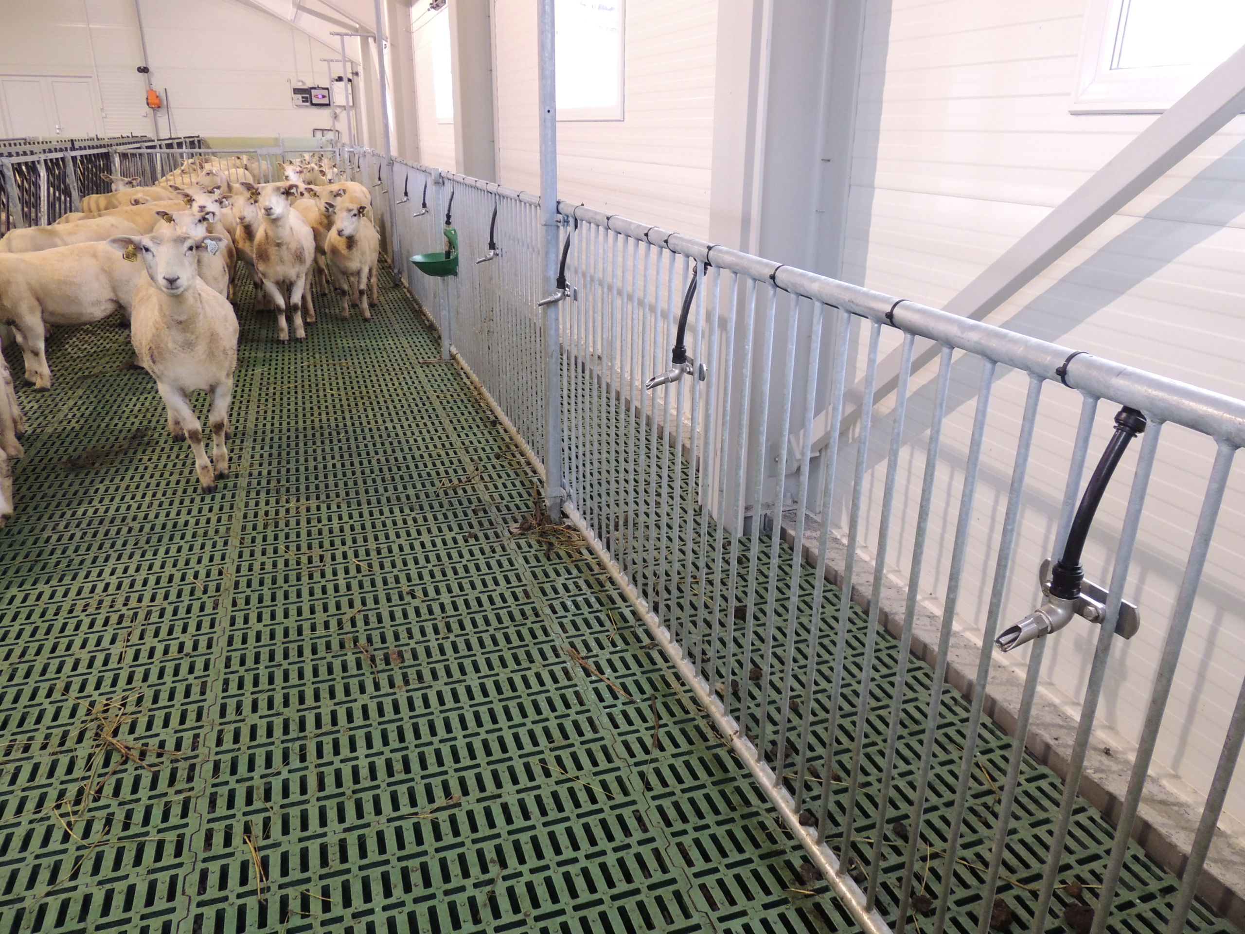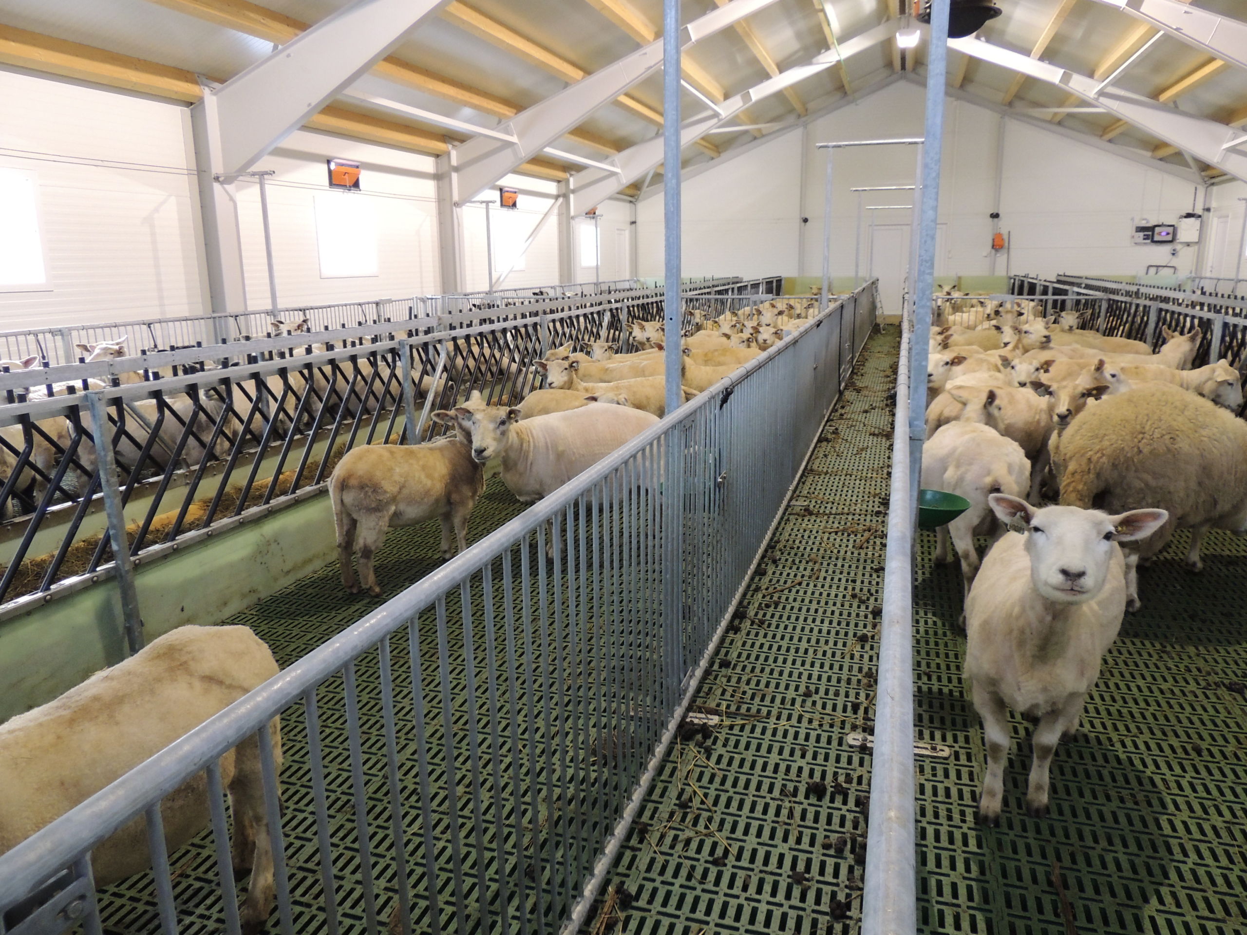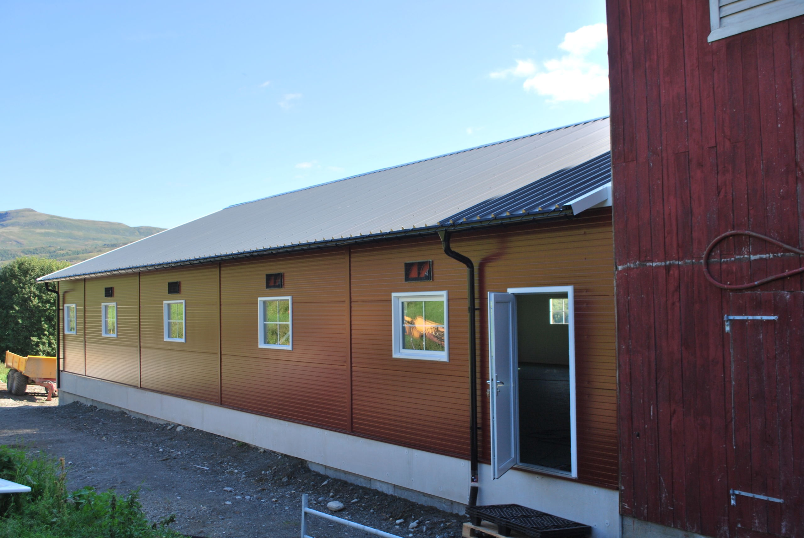 Fjøset er med stålkonstruksjon og sandwich, og er bygget over kjeller. Det er lagt Mik Stepper plastrister på stålbæring med 5 meters spenn. Det er valgt lammesikker front med glassfiber mot fôrbrett, og bingeskillene er både tette glassfiberskiller og med stående spiler. Vi har også levert Big Dutchman ventilasjon.