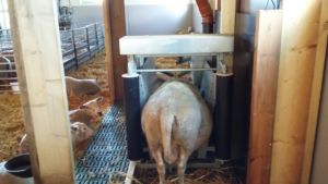 Sauen går på talle, mens fôrkassene er bygd opp med plastrister for å få en hygienisk og permanent eteplass. Vi har levert tre fôrkasser. Det er også to kraftfôrstasjoner i fjøset, som er bygd opp på samme måte som fôrkassene. Fjøset har Agrilight belysning.
