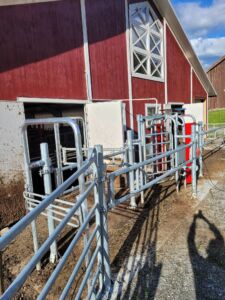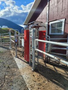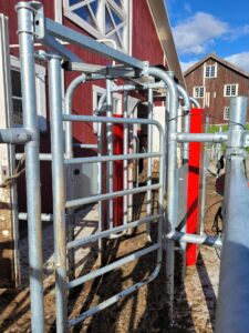 I vår støpte han platting på utsiden av fjøset og satte opp Lely Grazeway beiteport med tilhørende grinder og returgang. Beiteporten kan også monteres inne i fjøset om det er plass, men i dette fjøset går det en Lely Collector og samler møkka inne, så det ble best med utvendig montering.