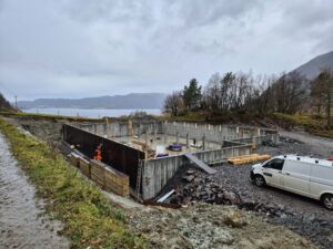 I høst startet vi med det nye fjøsbygget til Stine Rangnes og Torleif Staknes. Bygget er på rundt 830 m², med kjeller, fôrsentral og servicerom.