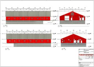 Fjøssystemer Bygg leverer stålkonstruksjon, limtreåser, vegg og takpanel i sandwich med dører, vinduer og port. Innvendige servicerom er bygd med sandwich.
