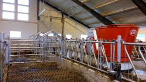 Det er fôrsentral i ene enden av bygget på ca 112 kvadratmeter. Her er det en Lely Vector som sørger for kontinuerlig utfôring av friskt fôr.